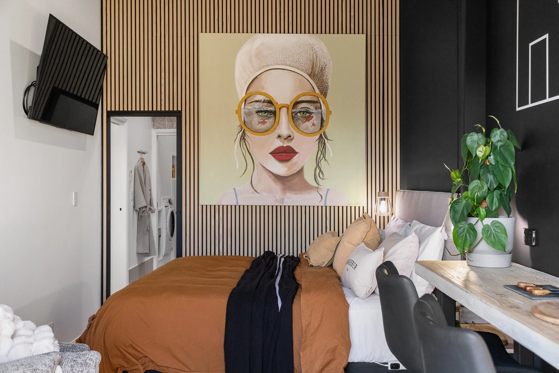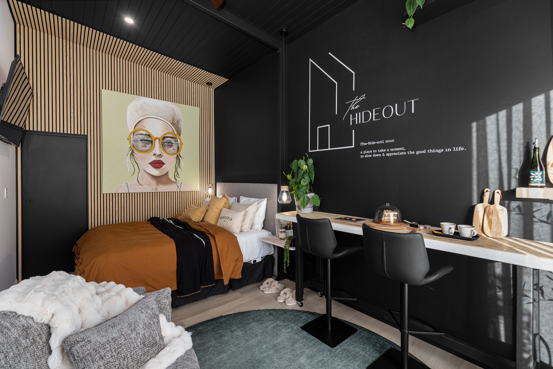 The Hideout is a mini, laidback lux accommodation space, designed for couples or solo guests to be able to escape the hustle and bustle of life and take some time out. This small space is 1 bedroom with a spacious bathroom and kitchenette/ Laundry.